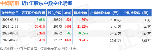 从股价来看,2025年12月31日至2026年3月31日,中钢洛耐区间跌幅为6.98%,在此期间股东户数增加321.0户,增幅为1.56%。