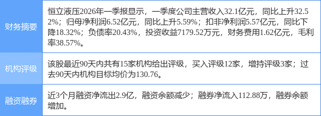 2026年4月23日,太平洋研究员崔文娟,张凤琳发布了对恒立液压的研报《主业稳健增长,线性驱动器项目进展顺利》,该研报对恒立液压给出“买入”评级。研报中预计2026年-2028年公司营业收入分别为136.29亿元、163.34亿元和191.97亿元,归母净利润分别为36.03亿元、45.05亿元和53.64亿元,对应PE分别为37倍、30倍、25倍。维持“买入”评级。证券之星数据中心根据近三年发布的研报数据计算,该研报作者对此股的盈利预测准确度为93.6%。