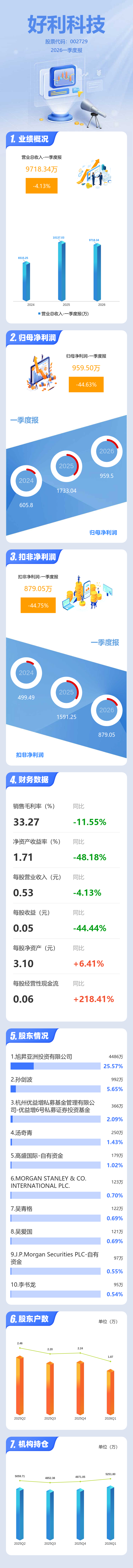 证券之星消息,好利科技2026年一季报显示,一季度公司主营收入9718.34万元,同比下降4.13%;归母净利润959.5万元,同比下降44.63%;扣非净利润879.05万元,同比下降44.76%;负债率16.75%,投资收益40.35万元,财务费用61.77万元,毛利率33.27%。