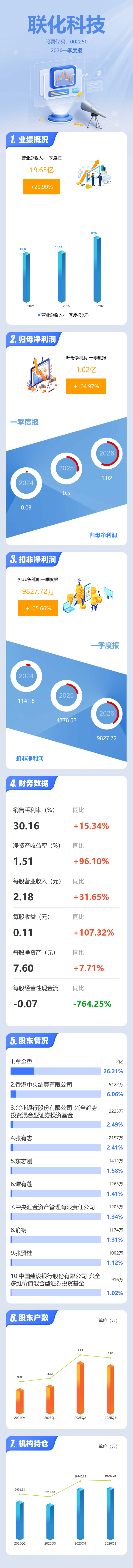 证券之星消息,联化科技2026年一季报显示,一季度公司主营收入19.63亿元,同比上升30.0%;归母净利润1.02亿元,同比上升104.97%;扣非净利润9827.72万元,同比上升105.66%;负债率47.78%,投资收益98.18万元,财务费用1.05亿元,毛利率30.16%。