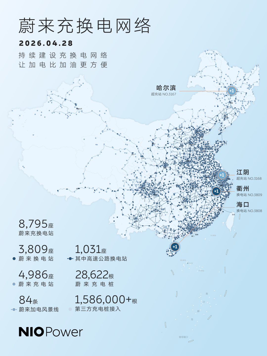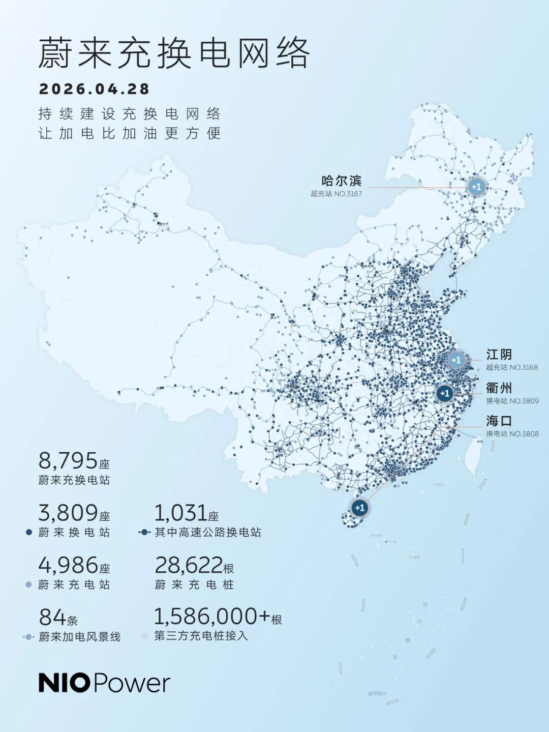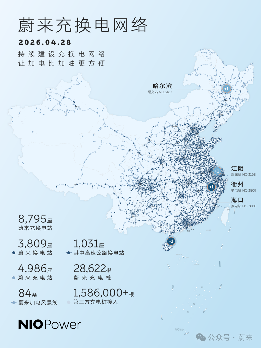 NO.3808 蔚来换电站 | 海口金巷路NO.3809 蔚来换电站 | 衢州258创新创业园NO.3167 蔚来超充站 | 哈尔滨延寿金街NO.3168 蔚来超充站 | 江阴新桥雍景园截至今日,蔚来全国建成8,795座充换电站,其中换电站3,809座,充电站4,986座、充电桩28,622根,累计提供超1亿次换电,持续建设,让加电比加油更方便!#蔚来 #蔚来换电去哪都方便 #蔚来ES9 #蔚来ES8 #蔚来ET5 #蔚来ET5T #蔚来ES6 #蔚来EC6 #蔚来ET9 点击即刻了解蔚来全系车型