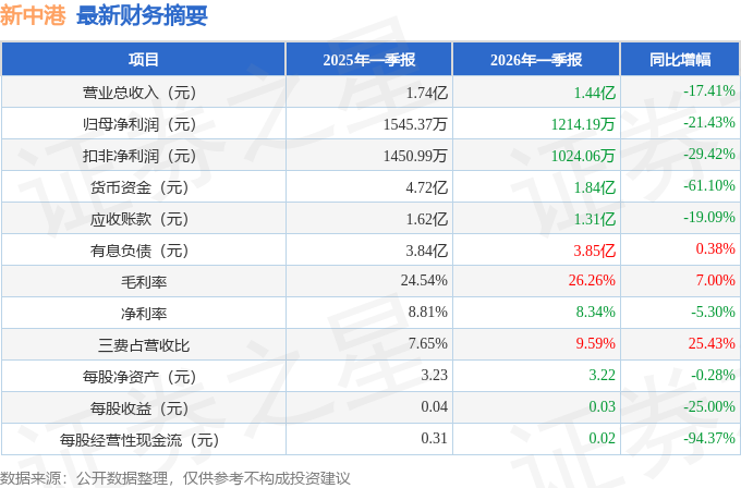据证券之星公开数据整理,近期新中港(605162)发布2026年一季报。截至本报告期末,公司营业总收入1.44亿元,同比下降17.41%,归母净利润1214.19万元,同比下降21.43%。按单季度数据看,第一季度营业总收入1.44亿元,同比下降17.41%,第一季度归母净利润1214.19万元,同比下降21.43%。本报告期新中港公司应收账款体量较大,当期应收账款占最新年报归母净利润比达106.69%。