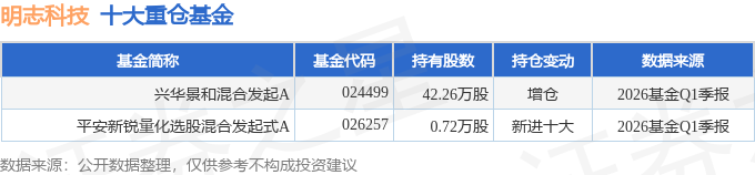 持有明志科技最多的基金为兴华景和混合发起A,目前规模为0.57亿元,最新净值1.426(4月24日),较上一交易日上涨0.54%。该基金现任基金经理为崔涛 黄生鹏。