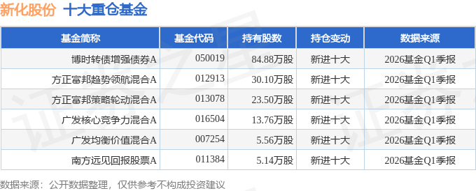 持有新化股份最多的基金为博时转债增强债券A,目前规模为11.86亿元,最新净值2.5381(4月24日),较上一交易日下跌0.76%,近一年上涨40.12%。该基金现任基金经理为过钧 高晖。