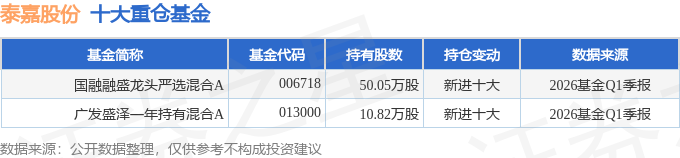 持有泰嘉股份最多的基金为国融融盛龙头严选混合A,目前规模为0.46亿元,最新净值1.6061(4月24日),较上一交易日上涨2.27%,近一年下跌7.59%。该基金现任基金经理为周德生。