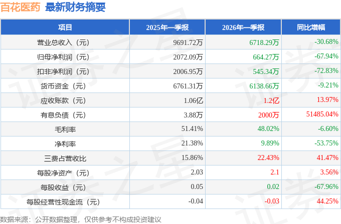 据证券之星公开数据整理,近期百花医药(600721)发布2026年一季报。截至本报告期末,公司营业总收入6718.29万元,同比下降30.68%,归母净利润664.27万元,同比下降67.94%。按单季度数据看,第一季度营业总收入6718.29万元,同比下降30.68%,第一季度归母净利润664.27万元,同比下降67.94%。本报告期百花医药三费占比上升明显,财务费用、销售费用和管理费用总和占总营收同比增幅达41.47%。