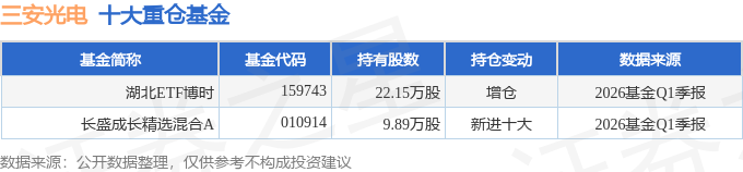 持有三安光电最多的基金为湖北ETF博时,目前规模为1.38亿元,最新净值1.4086(4月24日),较上一交易日下跌1.76%,近一年上涨63.18%。该基金现任基金经理为尹浩。