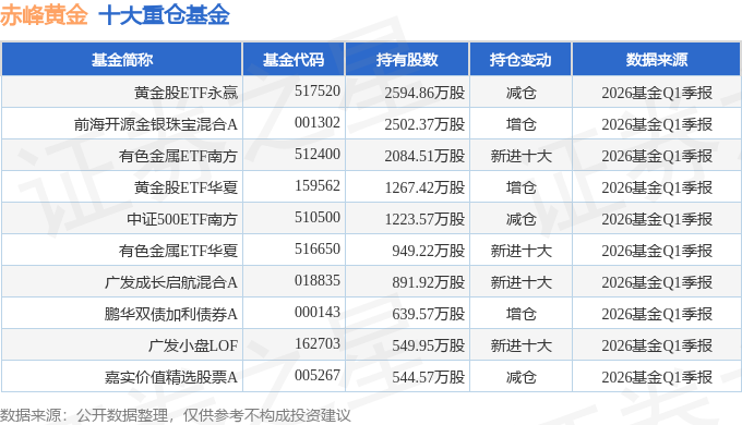 持有赤峰黄金最多的基金为黄金股ETF永赢,目前规模为128.21亿元,最新净值2.2119(4月24日),较上一交易日下跌0.5%,近一年上涨60.7%。该基金现任基金经理为刘庭宇。