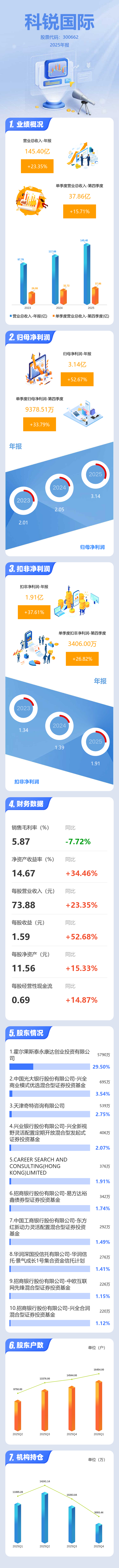证券之星消息,科锐国际2025年年报显示,当年度公司主营收入145.4亿元,同比上升23.35%;归母净利润3.14亿元,同比上升52.68%;扣非净利润1.91亿元,同比上升37.61%;其中2025年第四季度,公司单季度主营收入37.86亿元,同比上升15.71%;单季度归母净利润9378.51万元,同比上升33.79%;单季度扣非净利润3406.0万元,同比上升26.83%;负债率47.41%,投资收益7024.68万元,财务费用2130.94万元,毛利率5.87%。