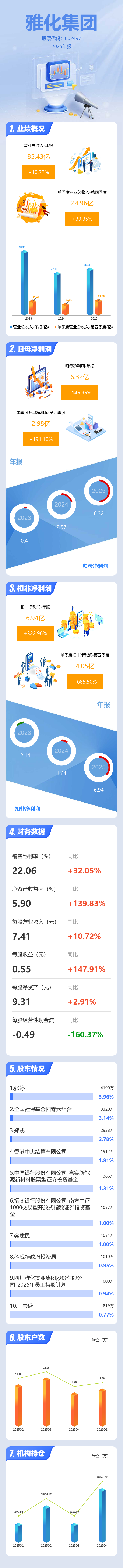 证券之星消息,雅化集团2025年年报显示,当年度公司主营收入85.43亿元,同比上升10.72%;归母净利润6.32亿元,同比上升145.95%;扣非净利润6.94亿元,同比上升322.97%;其中2025年第四季度,公司单季度主营收入24.96亿元,同比上升39.36%;单季度归母净利润2.98亿元,同比上升191.1%;单季度扣非净利润4.05亿元,同比上升685.5%;负债率26.17%,投资收益-4746.96万元,财务费用1829.73万元,毛利率22.06%。