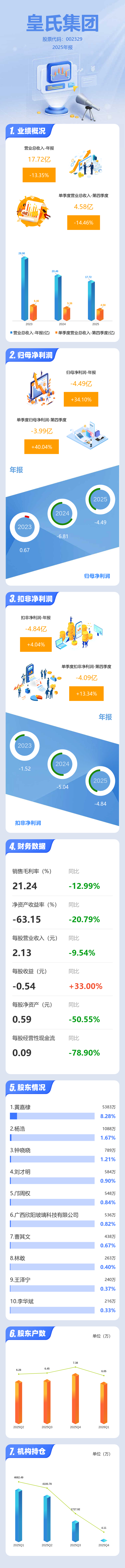证券之星消息,皇氏集团2025年年报显示,当年度公司主营收入17.72亿元,同比下降13.36%;归母净利润-4.49亿元,同比上升34.1%;扣非净利润-4.84亿元,同比上升4.05%;其中2025年第四季度,公司单季度主营收入4.58亿元,同比下降14.46%;单季度归母净利润-3.99亿元,同比上升40.05%;单季度扣非净利润-4.09亿元,同比上升13.35%;负债率86.33%,投资收益152.45万元,财务费用1.13亿元,毛利率21.24%。