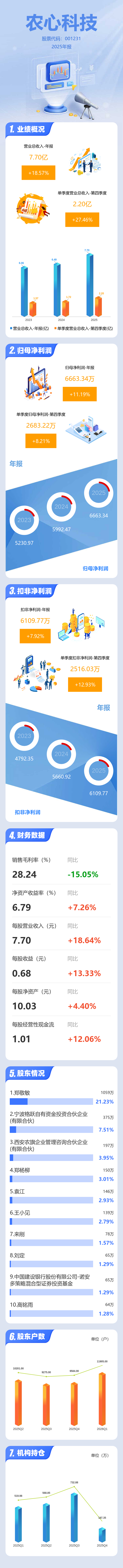 证券之星消息,农心科技2025年年报显示,当年度公司主营收入7.7亿元,同比上升18.57%;归母净利润6663.34万元,同比上升11.2%;扣非净利润6109.77万元,同比上升7.93%;其中2025年第四季度,公司单季度主营收入2.2亿元,同比上升27.47%;单季度归母净利润2683.22万元,同比上升8.21%;单季度扣非净利润2516.03万元,同比上升12.93%;负债率36.69%,投资收益283.43万元,财务费用18.48万元,毛利率28.24%。