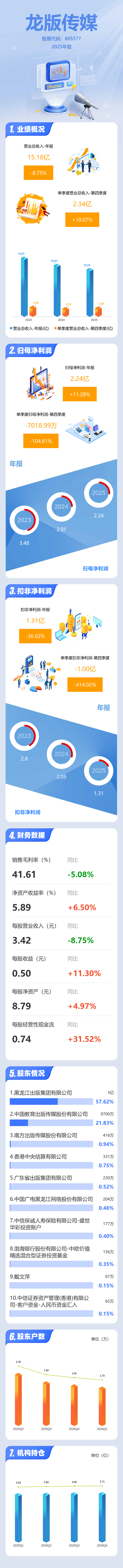 证券之星消息,龙版传媒2025年年报显示,当年度公司主营收入15.18亿元,同比下降8.76%;归母净利润2.24亿元,同比上升11.29%;扣非净利润1.31亿元,同比下降36.02%;其中2025年第四季度,公司单季度主营收入2.34亿元,同比上升10.08%;单季度归母净利润-7018.99万元,同比下降104.62%;单季度扣非净利润-1.0亿元,同比下降414.03%;负债率32.4%,投资收益125.99万元,财务费用-2586.3万元,毛利率41.61%。