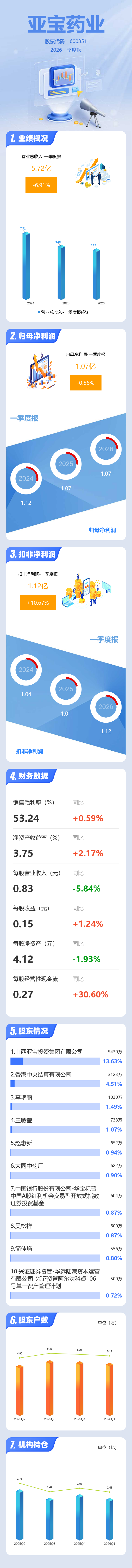 证券之星消息,亚宝药业2026年一季报显示,一季度公司主营收入5.72亿元,同比下降6.92%;归母净利润1.07亿元,同比下降0.57%;扣非净利润1.12亿元,同比上升10.67%;负债率14.79%,投资收益90.4万元,财务费用-36.04万元,毛利率53.24%。