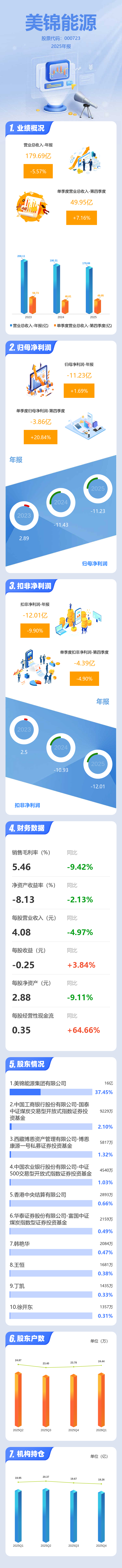 证券之星消息,美锦能源2025年年报显示,当年度公司主营收入179.69亿元,同比下降5.58%;归母净利润-11.23亿元,同比上升1.7%;扣非净利润-12.01亿元,同比下降9.9%;其中2025年第四季度,公司单季度主营收入49.95亿元,同比上升7.16%;单季度归母净利润-3.86亿元,同比上升20.85%;单季度扣非净利润-4.39亿元,同比下降4.9%;负债率65.15%,投资收益817.93万元,财务费用4.54亿元,毛利率5.46%。