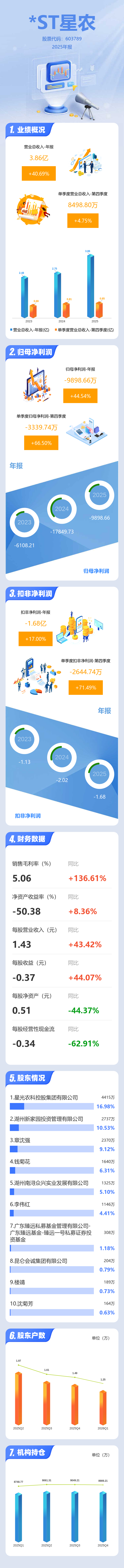 证券之星消息,*ST星农2025年年报显示,当年度公司主营收入3.86亿元,同比上升40.7%;归母净利润-9898.66万元,同比上升44.54%;扣非净利润-1.68亿元,同比上升17.01%;其中2025年第四季度,公司单季度主营收入8498.8万元,同比上升4.75%;单季度归母净利润-3339.74万元,同比上升66.51%;单季度扣非净利润-2644.74万元,同比上升71.5%;负债率79.61%,投资收益6368.46万元,财务费用1554.88万元,毛利率5.06%。