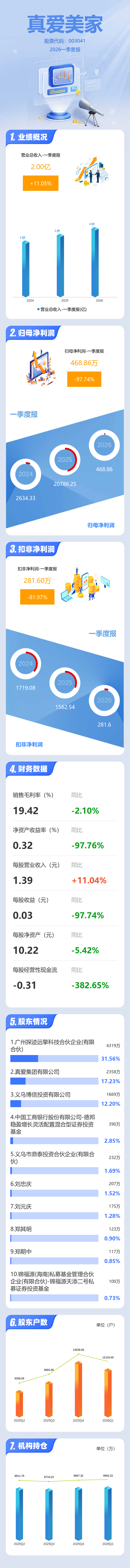 证券之星消息,真爱美家2026年一季报显示,一季度公司主营收入2.0亿元,同比上升11.05%;归母净利润468.86万元,同比下降97.74%;扣非净利润281.6万元,同比下降81.98%;负债率42.45%,投资收益93.11万元,财务费用915.99万元,毛利率19.42%。