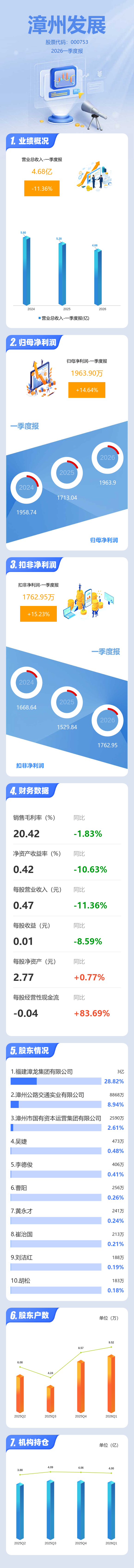 证券之星消息,漳州发展2026年一季报显示,一季度公司主营收入4.68亿元,同比下降11.37%;归母净利润1963.9万元,同比上升14.64%;扣非净利润1762.95万元,同比上升15.24%;负债率63.99%,投资收益-491.02万元,财务费用-4280.27万元,毛利率20.42%。
