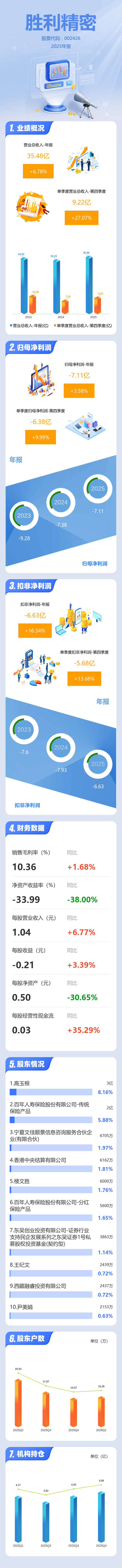 证券之星消息,胜利精密2025年年报显示,当年度公司主营收入35.48亿元,同比上升6.78%;归母净利润-7.11亿元,同比上升3.59%;扣非净利润-6.63亿元,同比上升16.34%;其中2025年第四季度,公司单季度主营收入9.22亿元,同比上升27.07%;单季度归母净利润-6.38亿元,同比上升10.0%;单季度扣非净利润-5.68亿元,同比上升13.69%;负债率71.45%,投资收益-141.1万元,财务费用1.05亿元,毛利率10.36%。