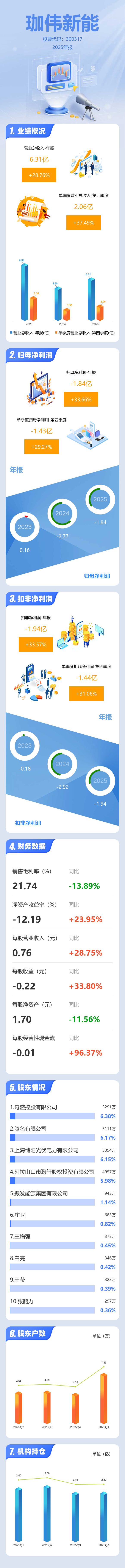 证券之星消息,珈伟新能2025年年报显示,当年度公司主营收入6.31亿元,同比上升28.76%;归母净利润-1.84亿元,同比上升33.67%;扣非净利润-1.94亿元,同比上升33.57%;其中2025年第四季度,公司单季度主营收入2.06亿元,同比上升37.5%;单季度归母净利润-1.43亿元,同比上升29.28%;单季度扣非净利润-1.44亿元,同比上升31.06%;负债率53.31%,投资收益583.22万元,财务费用4755.63万元,毛利率21.74%。
