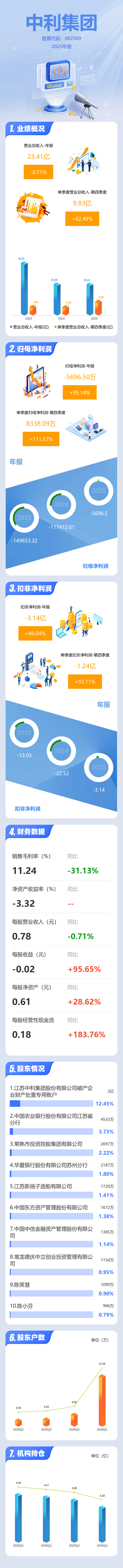 证券之星消息,中利集团2025年年报显示,当年度公司主营收入23.41亿元,同比下降0.72%;归母净利润-5696.5万元,同比上升95.15%;扣非净利润-3.14亿元,同比上升86.05%;其中2025年第四季度,公司单季度主营收入9.83亿元,同比上升82.5%;单季度归母净利润8338.09万元,同比上升111.58%;单季度扣非净利润-1.24亿元,同比上升93.11%;负债率60.48%,投资收益2685.16万元,财务费用7461.58万元,毛利率11.24%。