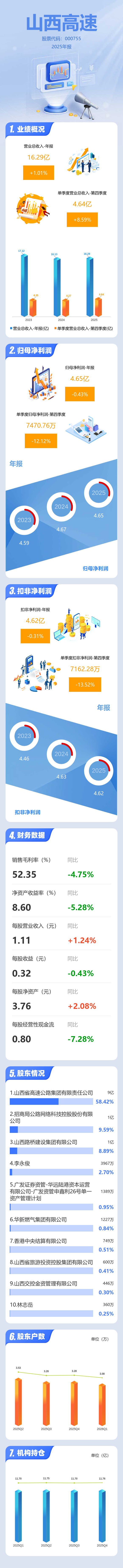 证券之星消息,山西高速2025年年报显示,当年度公司主营收入16.29亿元,同比上升1.01%;归母净利润4.65亿元,同比下降0.44%;扣非净利润4.62亿元,同比下降0.32%;其中2025年第四季度,公司单季度主营收入4.64亿元,同比上升8.6%;单季度归母净利润7470.76万元,同比下降12.13%;单季度扣非净利润7162.28万元,同比下降13.52%;负债率54.6%,财务费用1.47亿元,毛利率52.35%。