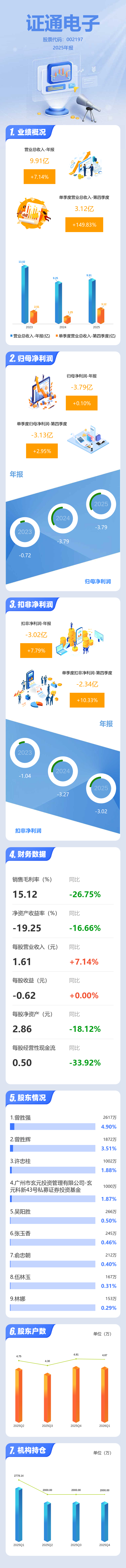 证券之星消息,证通电子2025年年报显示,当年度公司主营收入9.91亿元,同比上升7.15%;归母净利润-3.79亿元,同比上升0.1%;扣非净利润-3.02亿元,同比上升7.8%;其中2025年第四季度,公司单季度主营收入3.12亿元,同比上升149.84%;单季度归母净利润-3.13亿元,同比上升2.96%;单季度扣非净利润-2.34亿元,同比上升10.34%;负债率67.06%,投资收益-940.79万元,财务费用8050.6万元,毛利率15.12%。