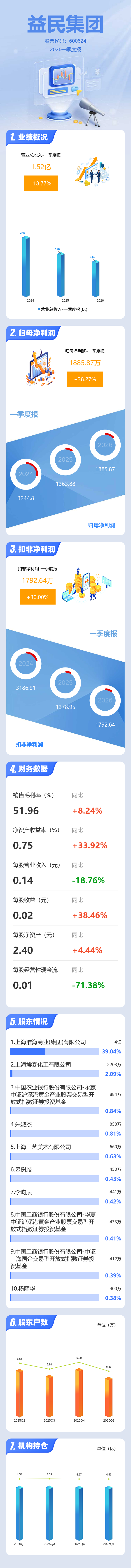 证券之星消息,益民集团2026年一季报显示,一季度公司主营收入1.52亿元,同比下降18.77%;归母净利润1885.87万元,同比上升38.27%;扣非净利润1792.64万元,同比上升30.0%;负债率14.3%,财务费用-161.1万元,毛利率51.96%。