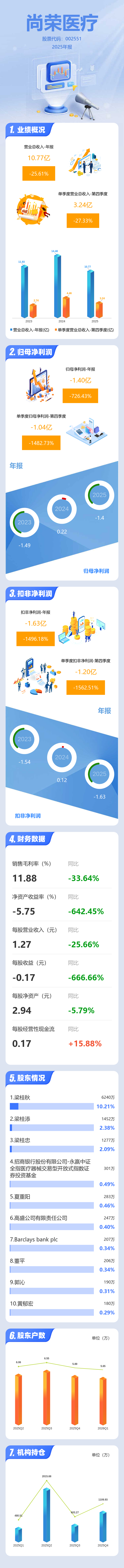 证券之星消息,尚荣医疗2025年年报显示,当年度公司主营收入10.77亿元,同比下降25.61%;归母净利润-1.4亿元,同比下降726.43%;扣非净利润-1.63亿元,同比下降1496.18%;其中2025年第四季度,公司单季度主营收入3.24亿元,同比下降27.33%;单季度归母净利润-1.04亿元,同比下降1482.73%;单季度扣非净利润-1.2亿元,同比下降1562.52%;负债率21.48%,投资收益1528.47万元,财务费用-1146.5万元,毛利率11.88%。