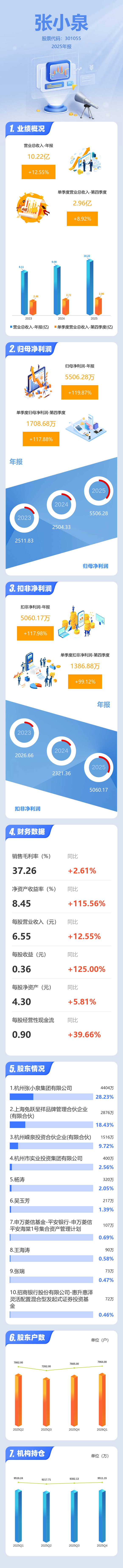 证券之星消息,张小泉2025年年报显示,当年度公司主营收入10.22亿元,同比上升12.55%;归母净利润5506.28万元,同比上升119.87%;扣非净利润5060.17万元,同比上升117.98%;其中2025年第四季度,公司单季度主营收入2.96亿元,同比上升8.93%;单季度归母净利润1708.68万元,同比上升117.88%;单季度扣非净利润1386.88万元,同比上升99.12%;负债率36.02%,投资收益34.44万元,财务费用-46.63万元,毛利率37.26%。