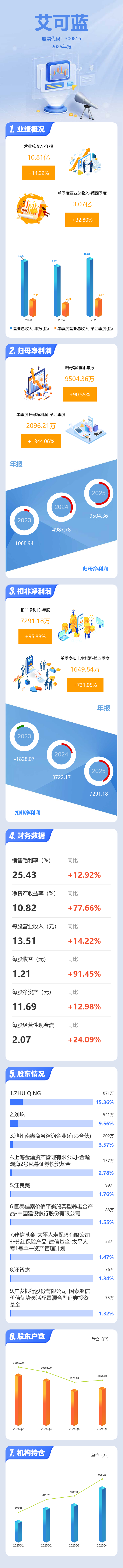 证券之星消息,艾可蓝2025年年报显示,当年度公司主营收入10.81亿元,同比上升14.22%;归母净利润9504.36万元,同比上升90.55%;扣非净利润7291.18万元,同比上升95.89%;其中2025年第四季度,公司单季度主营收入3.07亿元,同比上升32.81%;单季度归母净利润2096.21万元,同比上升1344.06%;单季度扣非净利润1649.84万元,同比上升731.05%;负债率59.39%,投资收益1584.06万元,财务费用2098.83万元,毛利率25.43%。