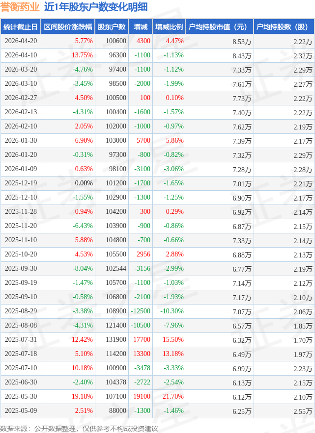 证券之星消息,近日誉衡药业披露,截至2026年4月20日公司股东户数为10.06万户,较4月10日增加4300.0户,增幅为4.47%。户均持股数量由上期的2.32万股减少至2.22万股,户均持股市值为8.53万元。