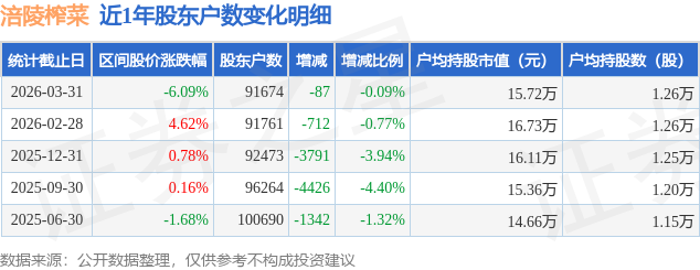 从股价来看,2026年2月28日至2026年3月31日,涪陵榨菜区间跌幅为6.09%,在此期间股东户数减少87.0户,减幅为0.09%。