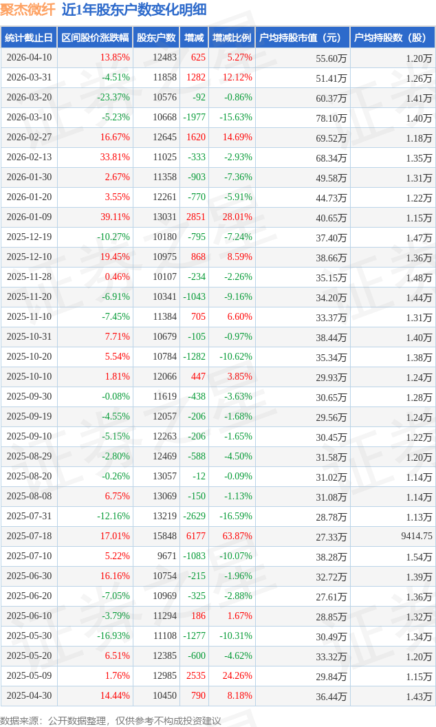从股价来看,2026年3月31日至2026年4月10日,聚杰微纤区间涨幅为13.85%,在此期间股东户数增加625.0户,增幅为5.27%。