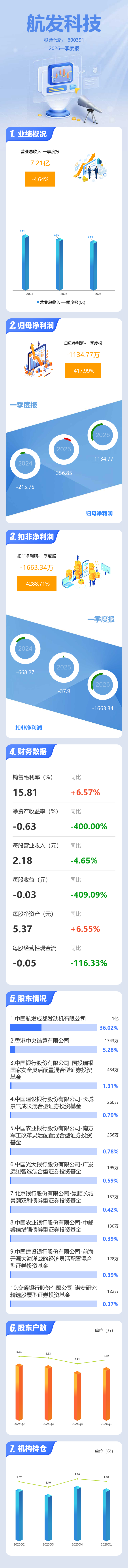 证券之星消息,航发科技2026年一季报显示,一季度公司主营收入7.21亿元,同比下降4.65%;归母净利润-1134.77万元,同比下降418.0%;扣非净利润-1663.34万元,同比下降4288.71%;负债率63.76%,投资收益-0.14万元,财务费用2424.28万元,毛利率15.81%。
