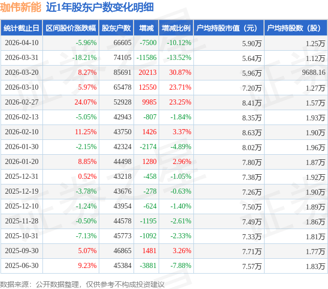 证券之星消息,近日珈伟新能披露,截至2026年4月10日公司股东户数为6.66万户,较3月31日减少7500.0户,减幅为10.12%。户均持股数量由上期的1.12万股增加至1.25万股,户均持股市值为5.9万元。