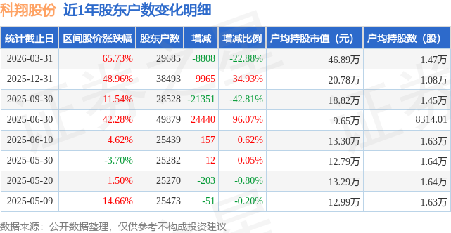 从股价来看,2025年12月31日至2026年3月31日,科翔股份区间涨幅为65.73%,在此期间股东户数减少8808.0户,减幅为22.88%。