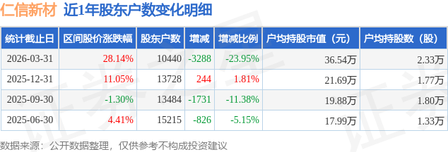 从股价来看,2025年12月31日至2026年3月31日,仁信新材区间涨幅为28.14%,在此期间股东户数减少3288.0户,减幅为23.95%。