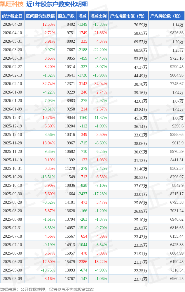 证券之星消息,近日凯旺科技披露,截至2026年4月20日公司股东户数为8402.0户,较4月10日减少1349.0户,减幅为13.83%。户均持股数量由上期的9827.0股增加至1.14万股,户均持股市值为76.59万元。