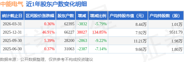 从股价来看,2025年12月31日至2026年3月31日,中能电气区间涨幅为0.36%,在此期间股东户数减少3832.0户,减幅为5.79%。