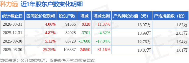 从股价来看,2025年12月31日至2026年3月31日,科力远区间涨幅为4.06%,在此期间股东户数增加9328.0户,增幅为11.37%。