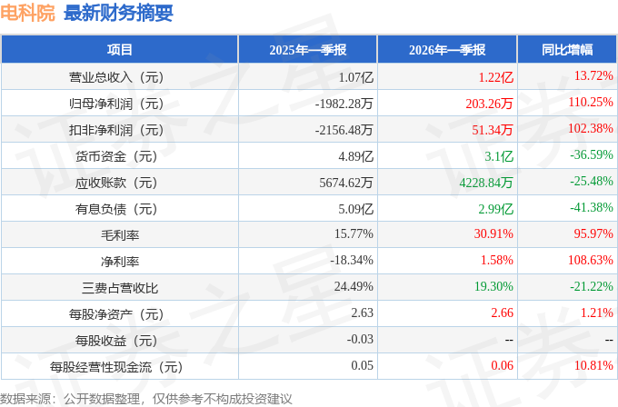 据证券之星公开数据整理,近期电科院(300215)发布2026年一季报。截至本报告期末,公司营业总收入1.22亿元,同比上升13.72%,归母净利润203.26万元,同比上升110.25%。按单季度数据看,第一季度营业总收入1.22亿元,同比上升13.72%,第一季度归母净利润203.26万元,同比上升110.25%。本报告期电科院盈利能力上升,毛利率同比增幅95.97%,净利率同比增幅108.63%。