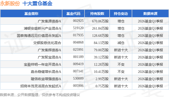 持有永新股份最多的基金为广发集源债券A,目前规模为70.46亿元,最新净值1.183(4月24日),较上一交易日下跌0.09%,近一年上涨7.4%。该基金现任基金经理为刘志辉。