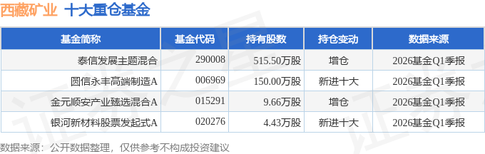 持有西藏矿业最多的基金为泰信发展主题混合,目前规模为17.61亿元,最新净值2.588(4月23日),较上一交易日下跌3.43%,近一年上涨158.03%。该基金现任基金经理为黄潜轶。