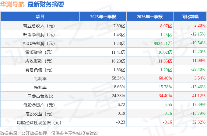 据证券之星公开数据整理,近期华测导航(300627)发布2026年一季报。截至本报告期末,公司营业总收入8.07亿元,同比上升2.28%,归母净利润1.25亿元,同比下降12.15%。按单季度数据看,第一季度营业总收入8.07亿元,同比上升2.28%,第一季度归母净利润1.25亿元,同比下降12.15%。本报告期华测导航三费占比上升明显,财务费用、销售费用和管理费用总和占总营收同比增幅达41.12%。