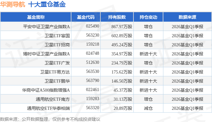 持有华测导航最多的基金为平安中证卫星产业指数A,目前规模为4.62亿元,最新净值1.2833(4月23日),较上一交易日下跌0.63%。该基金现任基金经理为翁欣 马浩然。
