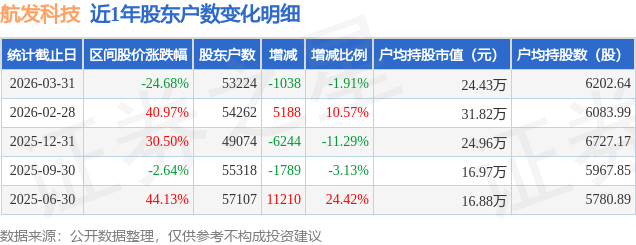 从股价来看,2026年2月28日至2026年3月31日,航发科技区间跌幅为24.68%,在此期间股东户数减少1038.0户,减幅为1.91%。