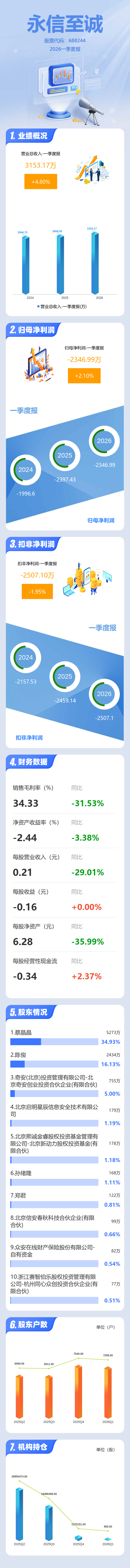 证券之星消息,永信至诚2026年一季报显示,一季度公司主营收入3153.17万元,同比上升4.81%;归母净利润-2346.99万元,同比上升2.1%;扣非净利润-2507.1万元,同比下降1.95%;负债率11.61%,投资收益39.1万元,财务费用-22.79万元,毛利率34.33%。
