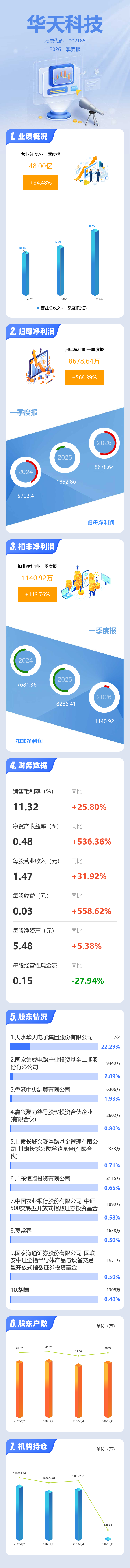 证券之星消息,华天科技2026年一季报显示,一季度公司主营收入48.0亿元,同比上升34.49%;归母净利润8678.64万元,同比上升568.39%;扣非净利润1140.92万元,同比上升113.77%;负债率52.21%,投资收益4117.1万元,财务费用7750.01万元,毛利率11.32%。