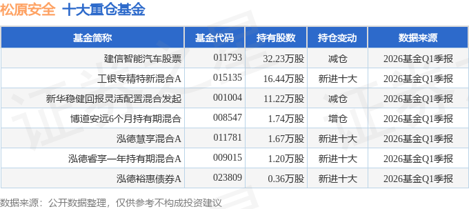 持有松原安全最多的基金为建信智能汽车股票,目前规模为1.8亿元,最新净值1.0279(4月24日),较上一交易日上涨1.06%,近一年上涨33.58%。该基金现任基金经理为田元泉 张湘龙。
